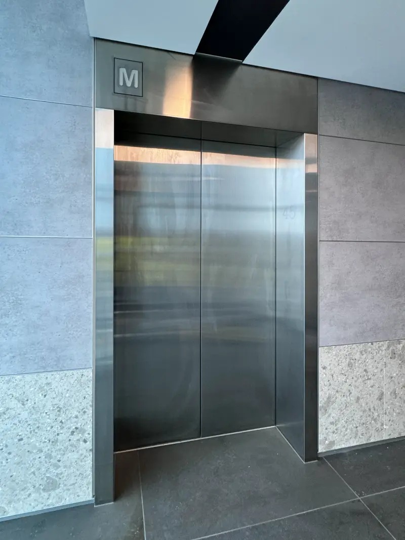 External elevator doors in a mid-rise West Perth office building were showing signs of age. The stainless steel was wrapped with 3M DI-NOC oak, complementing the building's updated lobby finishes.